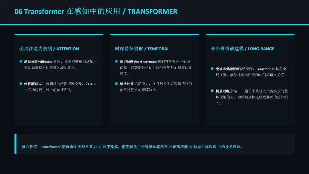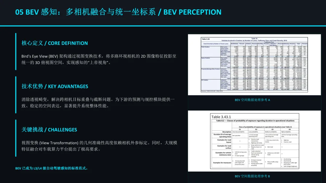 当前主流的感知架构已从传统的单视角图像处理,全面转向基于BEV (Bird's Eye View) 的多传感器融合。BEV 架构通过 Transformer 模型将多路摄像头、雷达、激光雷达数据统一到鸟瞰视角下的三维空间,解决了传感器间坐标系不一致和遮挡问题。