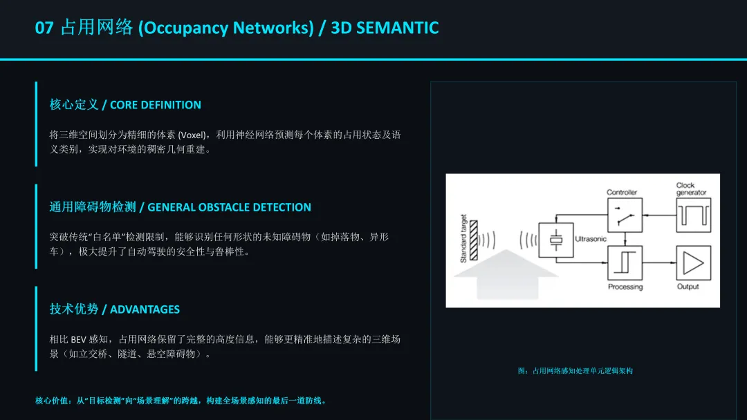 在此基础上,占用网络(Occupancy Networks)成为感知层面的最新突破。它不再局限于检测预定义的物体类别(如车辆、行人),而是对整个三维空间进行细粒度的体素(Voxel)划分,预测每个体素的占用概率和语义信息。这使得系统能够识别和避让任意形状的通用障碍物,极大地提升了对“未知”物体的处理能力。