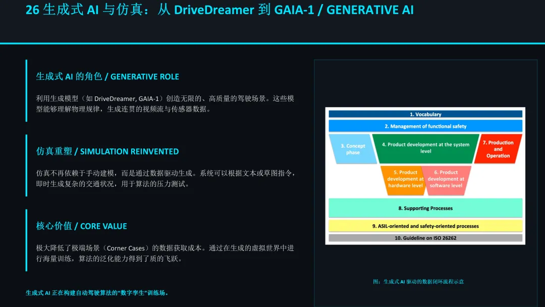 世界模型(如DriveDreamer, GAIA-1)能够根据真实数据学习物理世界的动态规律,并生成无限逼真、符合物理约束的虚拟驾驶场景。这使得自动驾驶系统能够以极低的成本,在虚拟环境中对数百万种极端情况进行训练和压力测试,极大地加速了算法的迭代速度。