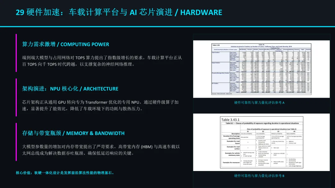 端到端大模型的部署对底层算力提出了极高要求。车载计算平台正从百TOPS 向千 TOPS 跨越,芯片架构也从通用 GPU 转向专为 Transformer 优化的 NPU(神经网络处理器)。高带宽内存(HBM)和高速车载总线成为解决数据吞吐瓶颈的关键。