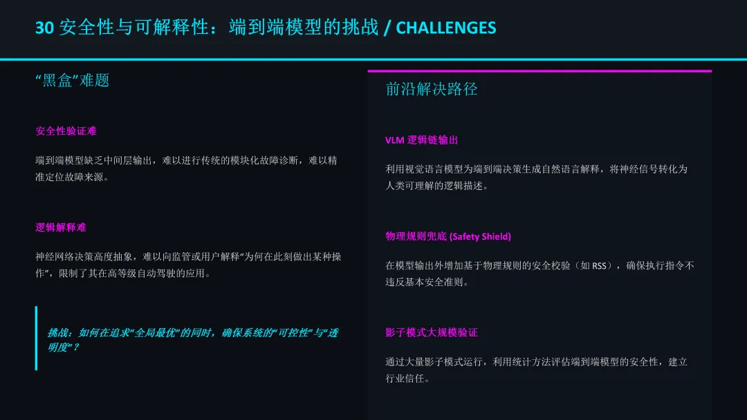 然而,端到端模型也带来了“黑盒”难题,即缺乏可解释性,难以进行传统的故障诊断和安全验证。