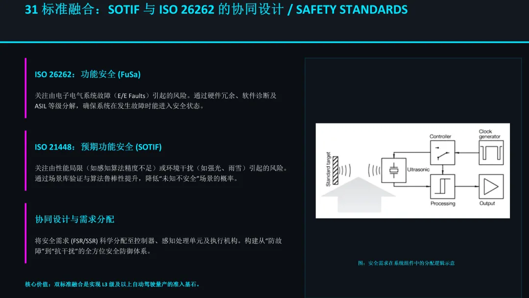 协同设计是关键,即在设计之初就将功能安全和预期功能安全的需求进行统一规划和分配,构建从“防故障”到“抗干扰”的全方位安全防御体系。