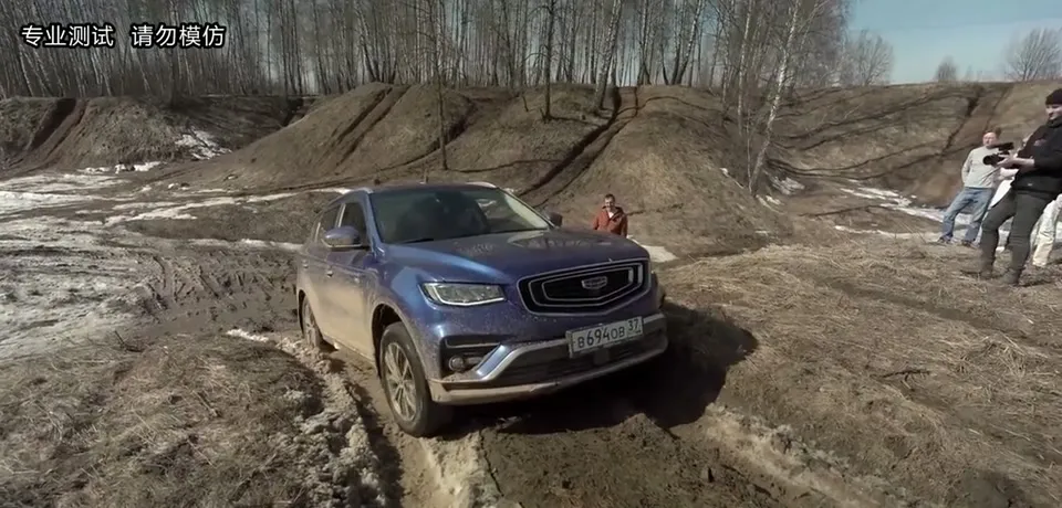 但是吉利博越就没那么幸运了。一上坡就四轮打滑,折腾半天