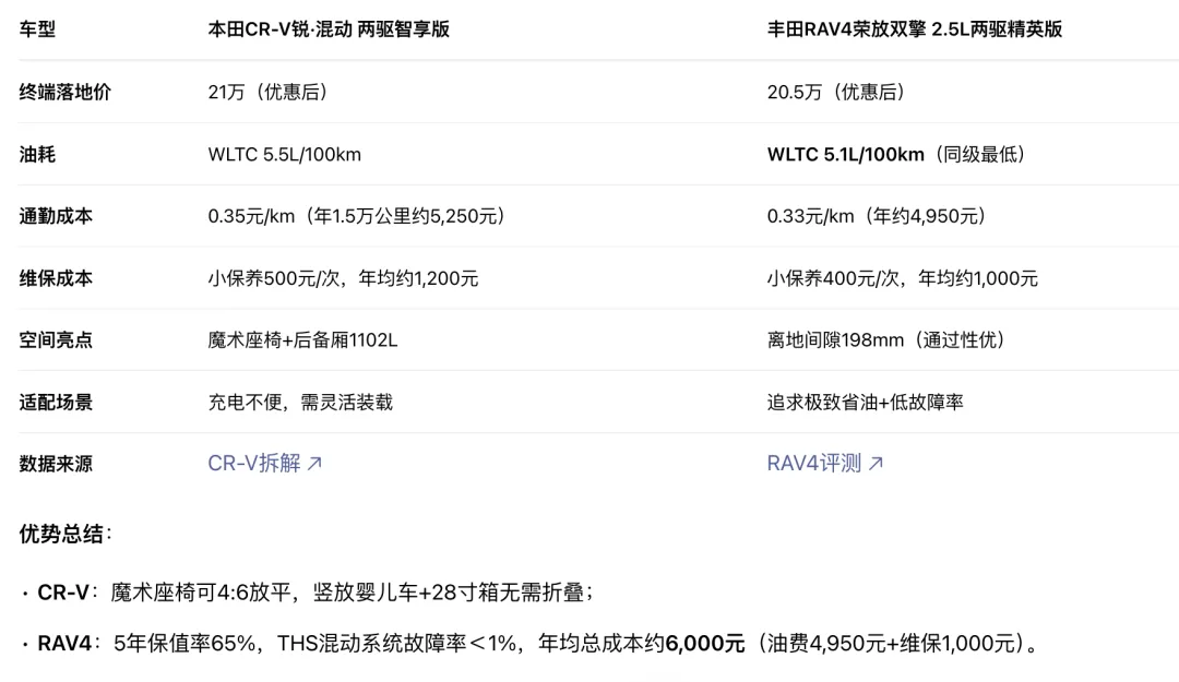 推荐车型:RAV4双擎(20.5万落地,年均成本6,000元);