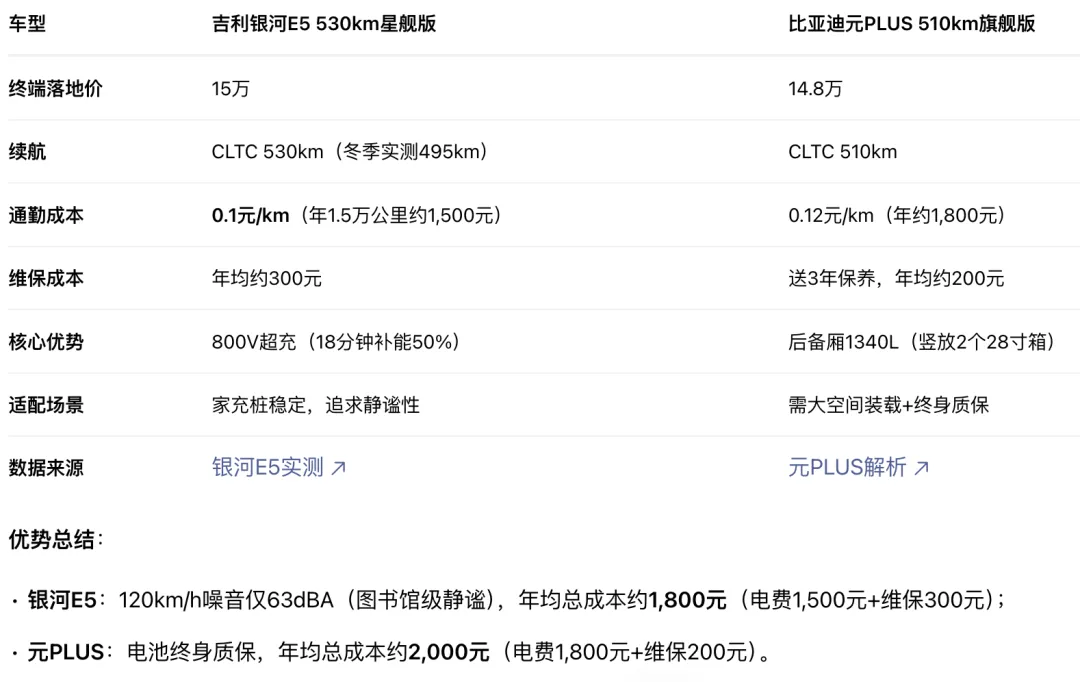 有家充桩 → 闭眼入银河E5(15万级续航530km+每公里0.1元,年均成本1,800元,静谧性碾压混动);
