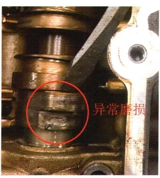 询问用户得知,该车在出现故障时重新启动,启动机运转但发动机无法怠速运转,且无任何异响。使用诊断仪读取故障码,在发动机控制单元里有故障码:“气缸6,检测到不发火,气缸压缩比”。根据故障现象分析,如果只是6缸单独不工作,不至于造成发动机熄火。征求车主同意后尝试启动车辆,发动机有启动成功的迹象但无法怠速运转。再次尝试启动车辆,同时将加速踏板、制动踏板都踩到底,发动机开始运转,但松开加速踏板后还是无法维持怠速运转。此时读取故障码,故障码和原来一样。将6缸火花塞拆下,发现有明显的汽油味,由此判断喷油器无明显异常。将其他气缸的火花塞和点火线圈与该气缸的互换,故障依旧且故障码没有转移。用二极管试灯检测该气缸的初级点火信号,无异常;用试灯检测点火线圈的供电、搭铁,均未见异常。由于无其他与电气相关的故障码,所以暂不考虑点火、喷油系统故障。测量各个气缸的压力,6缸的压力为0 MPa,其他气缸均在1 MPa以上,6缸压力明显异常。因气缸压力较小,怀疑是由于气门关闭不严引起的。经车主同意后拆解气缸盖罩检查,当气缸盖罩拆除之后,发现摇臂存在移位。查看气缸盖上的其余附件发现凸轮轴以及AVS调节阀存在不同程度的磨损。