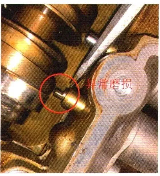 分析故障原因是由于摇臂的故障,导致摇臂与进气门之间相互配合出现问题,气门关闭不严,气缸压力明显不足。而AVS调节阀与可移动的凸轮块还可以正常移动与调节,当AVS将凸轮块调节到大凸轮的过程时,由于凸轮块与摇臂不能正常的相互对应,摇臂会对凸轮块顶部产生磨损,并且阻止凸轮块的移动。此时,AVS调节阀还处在滑槽中,没有完成调节,AVS金属销与滑槽一直接触,导致了磨损的出现。