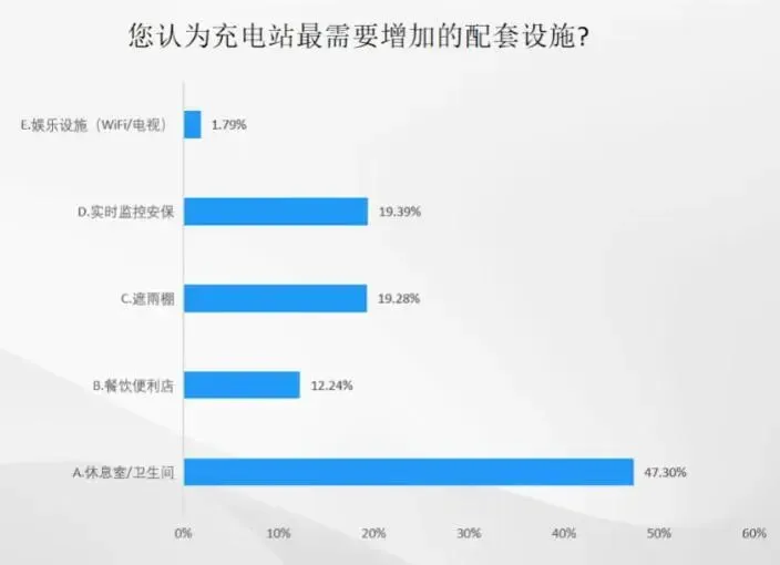 在“最需要增加的配套设施”调查中,近半数(47.30%)用户选择“休息室/卫生间”。数据表明,当前多数充电站仍主要围绕充电功能布局,对于用户在充电过程中产生的停留、休憩等实际需求关注不足,人性化服务设施存在明显缺口。
