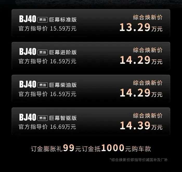 BJ40巨幕版凭价格重塑市场,这波冲击来的真快。官方指导价15.59万起,终端综合补贴后仅13.29万起,既守住了品牌价值,又用国补+厂补的实打实优惠,给消费者来了一波强力冲击,同时也颠覆了自身产品线和同级竞品的格局。
