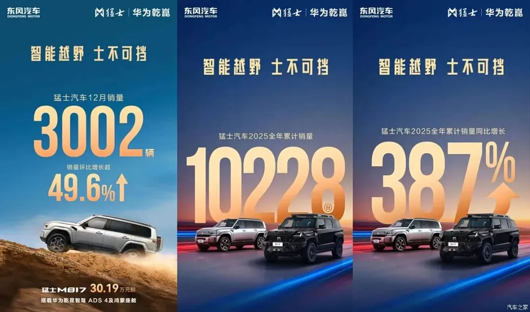 岁末之际,猛士科技交出2025年终答卷:全年累计销售10228台,较2024年实现近4倍增长(+387%);12月单月更以3002辆、环比49.6%的增速收官。更具象征意义的是,猛士M817第10000台整车于年底正式下线——这不仅是该车型自身的里程碑,更是东风体系第100万辆新能源产品的历史性节点。凭借全栈华为智能化解决方案的加持,M817仅用4个月即完成从零到万的产能爬坡,在高端智能越野赛道跑出量产加速度。