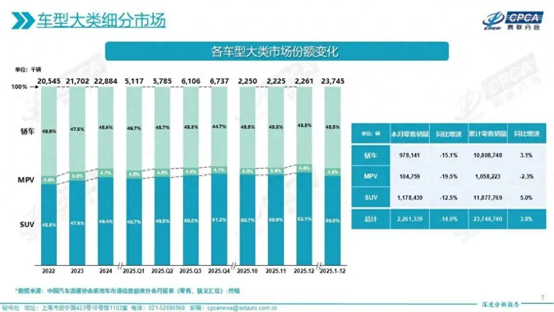 拐点就是在24年,这一年大6座SUV逐步成熟,在25年迎来全面爆发,开始挤压MPV的市场份额,虽然去年MPV销量下滑2.3%不算是一个较大的数据。