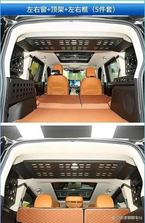 内饰方面倒没有玩虚的,该给的舒适和科技都没少。中控台走的是简约硬派路线,大面积搪塑材质,银色饰板点缀,既耐看又不廉价。12.3英寸中控大屏+液晶仪表,车机系统支持手机互联、在线导航、语音助手,连后排都配了USB和小桌板,明显就是为长途自驾和露营设计的。最有意思的是后排座椅——一键放倒,秒变1.8米大床,配合车载220V电源,哪怕是南方湿冷的夜晚,来个车内露营都不怕。