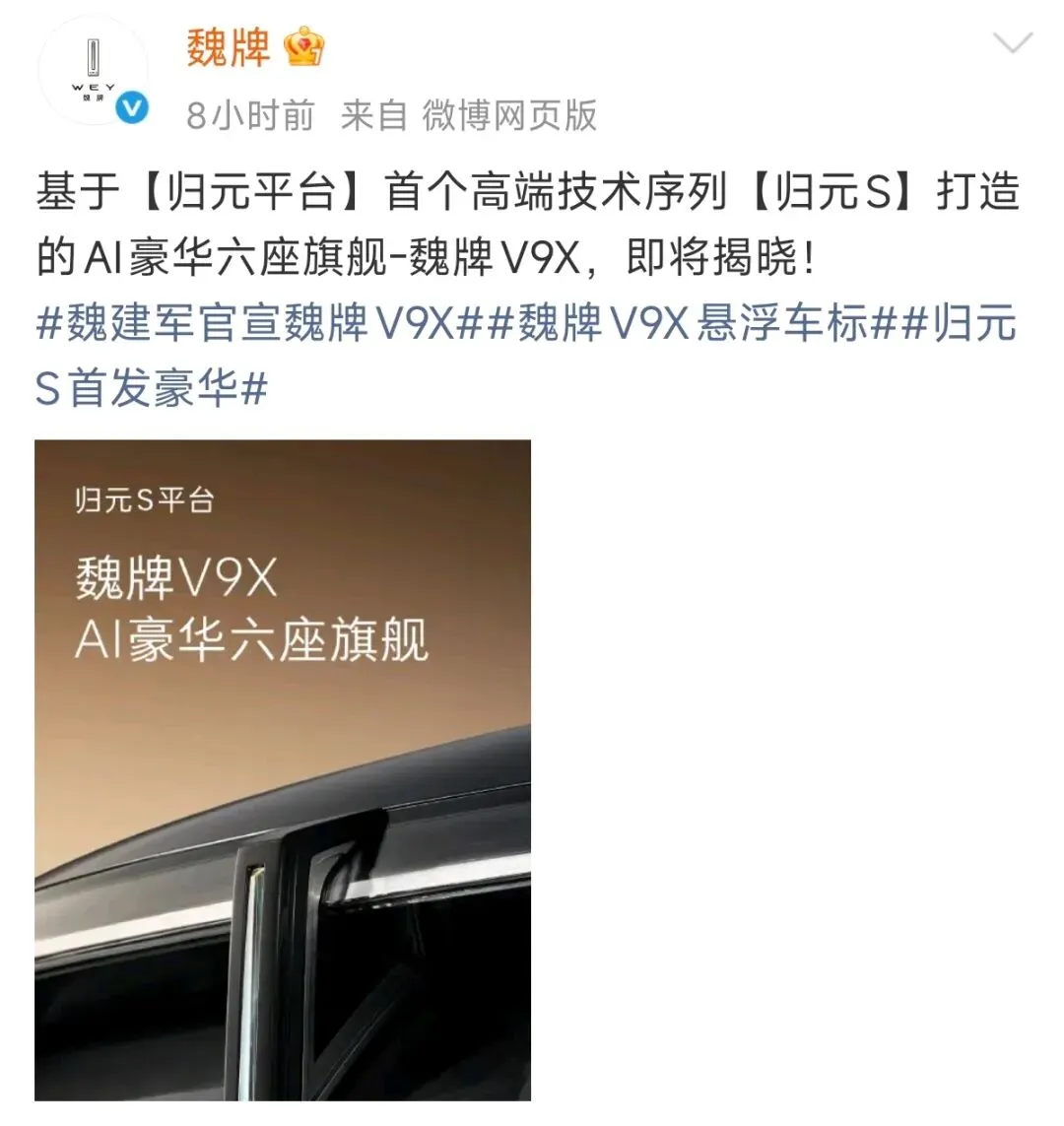魏牌日前在其官微上发布了一张海报,正式官宣其全新旗舰SUV命名为V9X,定位"AI豪华六座旗舰",该车基于归元平台首个高端技术序列“归元S”打造。