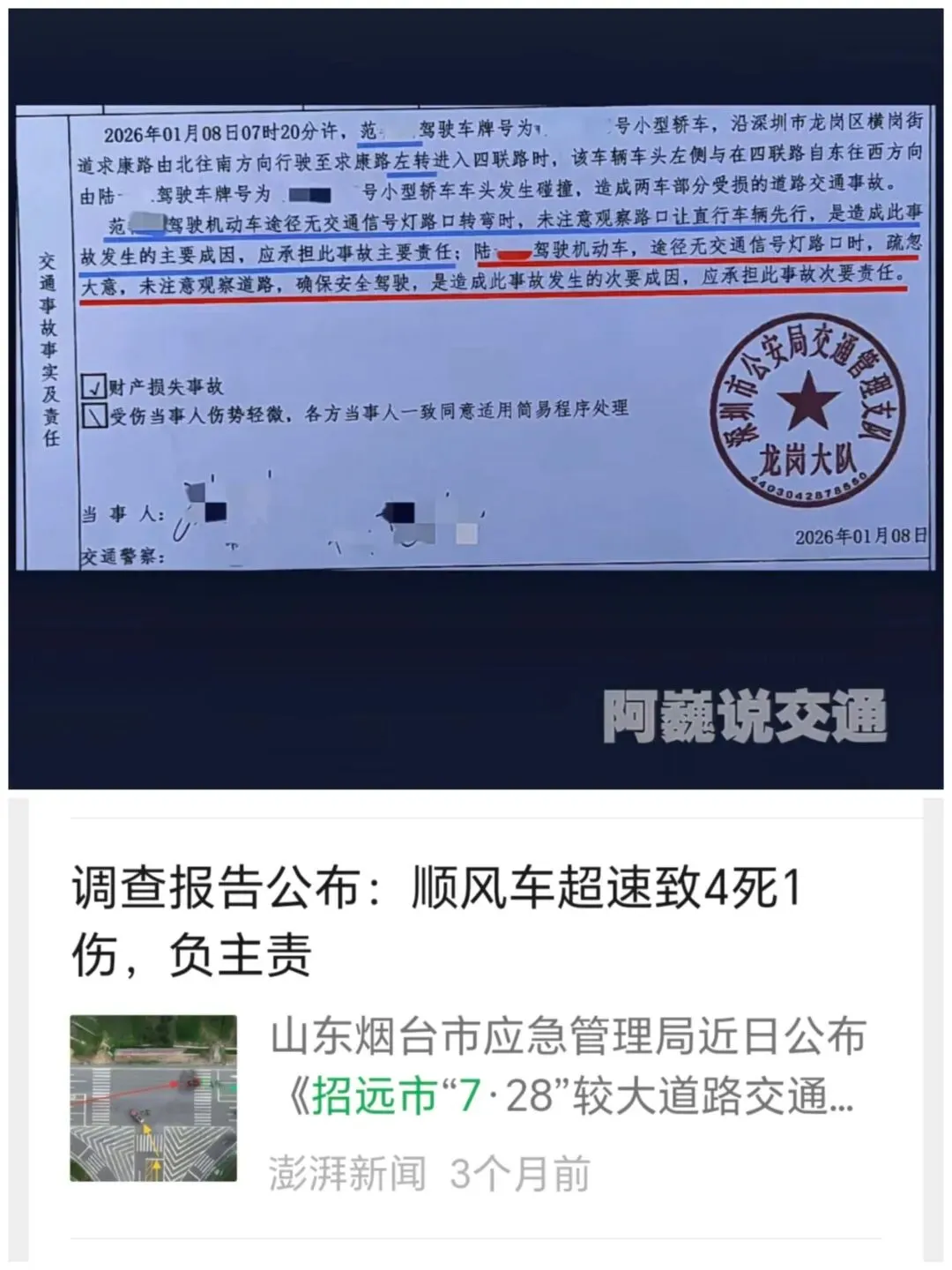 第一起事故发生于T型交叉路口,博主“阿巍说交通”分享的案例中,本道直行车尚未越过停止线、未进入交叉路口,且未履行停车瞭望义务,与已驶入路口的右道左转弯车发生碰撞。龙岗交警大队最初认定本道直行车全责,经复核后撤销原结论,重新认定右道左转弯车未让行直行车,承担主要责任,本道直行车负次要责任。第二起事故则发生在山东烟台招远市,同样是T型路口本道超速直行车与右道左转弯车的无接触事故,最终认定本道直行车因严重超速、加重事故损害后果而承担主要责任,左转弯车负次要责任。两起事故形态高度相似,均是直行车与右道转弯车在T型路口的通行冲突,但责任划分的差异,核心源于对“停车瞭望”义务履行情况和“让行规则”适用场景的不同判断。
