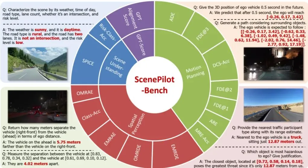 有了高质量的数据集,接下来就是设计“考题”和“评分标准”了。ScenePilot-Bench将评估分解为四个维度,相当于四个科目,对VLM进行全方位“拷问”。
