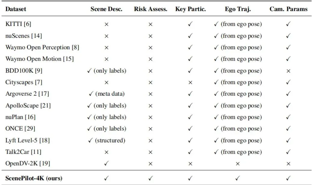 表1:不同基线数据集与我们提出的ScenePilot-4K数据集的比较。(a)与规模相关的统计信息。(b)标注可用性。