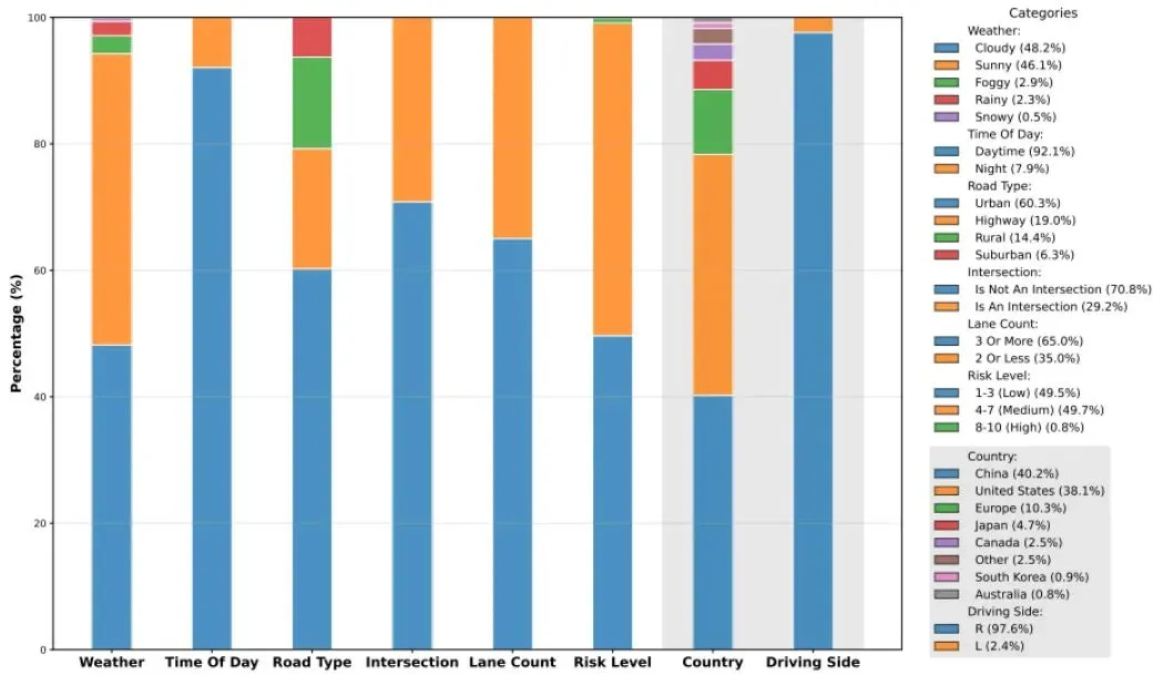 从图3可以看到,数据涵盖了晴天、雨天、夜晚等多种天气和时间,以及城市道路、高速公路等不同场景,风险等级也呈长尾分布(高风险场景虽少但关键)。这保证了评估的全面性和对极端情况的覆盖。