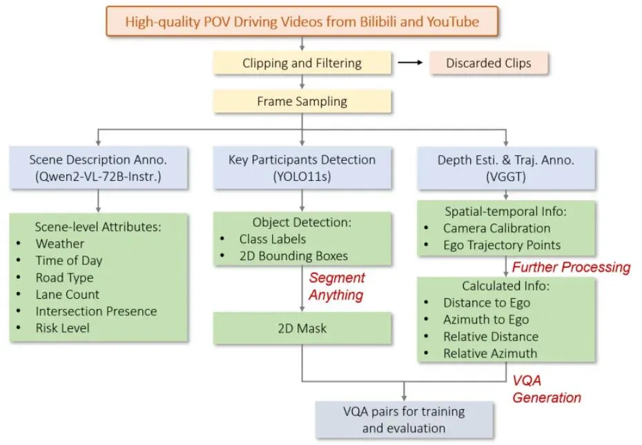 手动标注这么大规模的数据是天方夜谭。论文采用了自动化流水线(图4):· 场景与风险:用强大的VLM(Qwen2-VL-72B)自动生成文字描述和风险等级。· 物体检测:用YOLO11s检测出各类交通参与者。· 几何与轨迹:这是核心黑科技!使用一个叫VGGT(Visual Geometry Grounded Transformer)的模型,仅从单目视频就能估计出相机参数和每一帧车子的精确位置。有了相机位置,就能计算出自车轨迹。公式很简单:用后面每一帧相机的位置减去第一帧的位置。