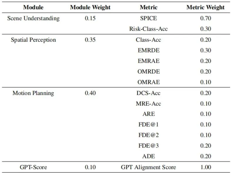 简单说,就是把所有分数都映射到0-100分。对于误差类指标,采用分段函数:误差小的给满分,误差中等的线性扣分,误差巨大的则指数级严厉扣分(因为自动驾驶中大误差不可接受)。表3列出了各个误差指标的具体映射参数。最后,根据每个能力模块对自动驾驶安全的重要性进行加权(表4)。可以看出,空间感知(权重0.35)和运动规划(权重0.4)占了最大头,这体现了基准的导向:光会“说”不行,必须“感知得准”、“规划得稳”。表4:ScenePilot-Bench基准评估框架的加权结构。实验结果揭示:通用大模型与专用模型谁更胜一筹?