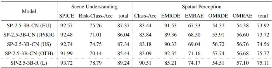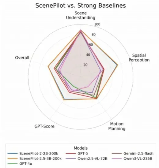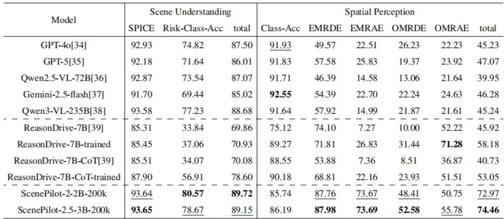 考卷出好了,是时候找一批“考生”来测测了。论文测试了三类模型:1. 通用巨无霸:GPT-4o, GPT-5, Qwen2.5-VL-72B, Gemini-2.5-flash等。它们知识渊博,但未经驾驶特训。2. 驾驶专科生:ReasonDrive-7B及其微调变体。这是专门为驾驶推理设计的小模型。3. 本数据集培养的“优等生”:直接用Qwen系列骨干模型在ScenePilot-4K上微调得到的ScenePilot模型。表5:各种VLM在ScenePilot-Bench基准上的比较。