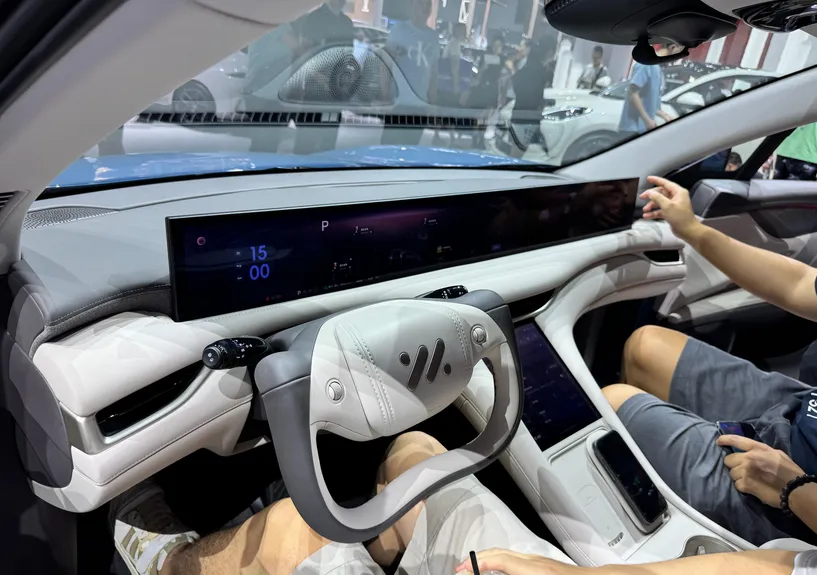 最引人注目的是中控台上那块贯通左右的IMAX级全景智慧屏,它不仅尺寸震撼,更可支持升降功能,配合半辐式方向盘,营造出极具未来感的驾驶环境。
