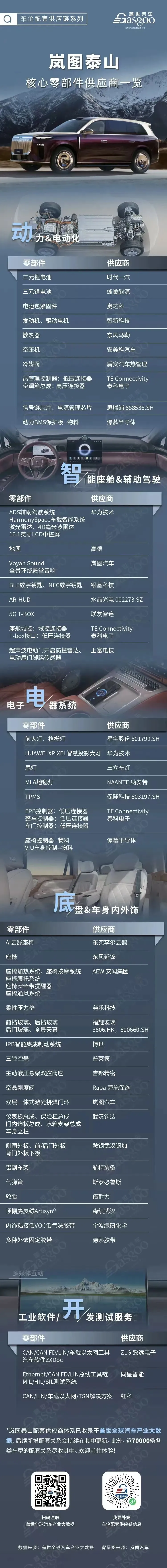 为进一步拆解这款旗舰SUV的核心竞争力,盖世汽车收集整理了岚图泰山的核心零部件供应商信息,欢迎更多行业朋友进行信息补充和更正。