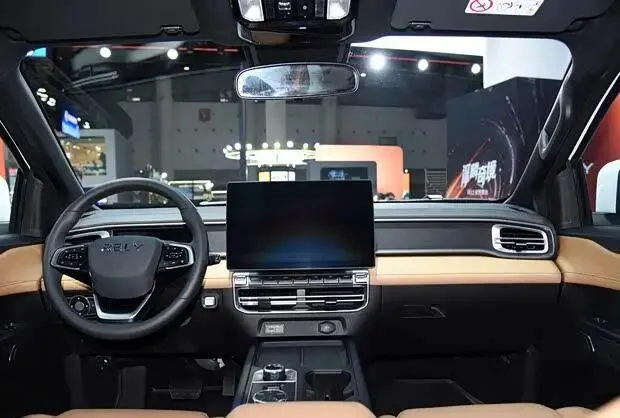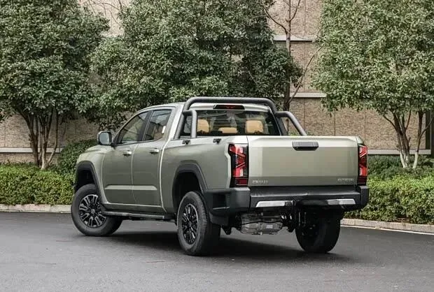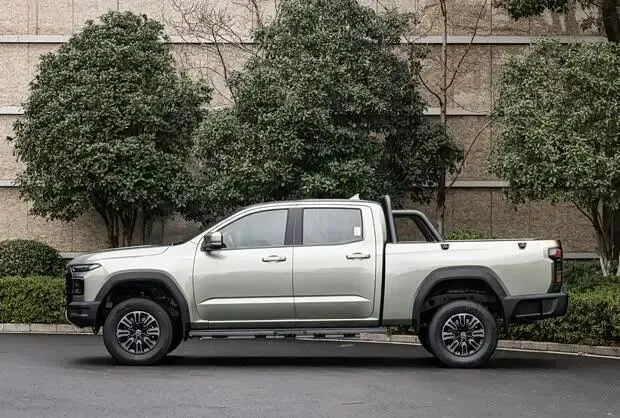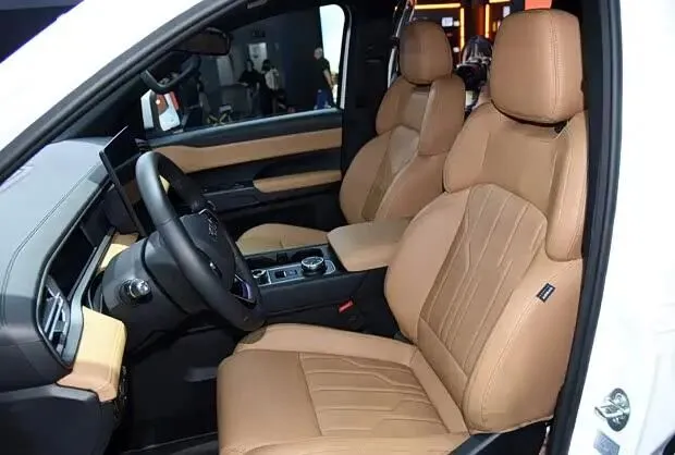 进入车内,该车虽为皮卡定位,但内饰设计注重科技感与舒适性。车内配备三辐式多功能方向盘,并提供15.6英寸与12.3英寸两种尺寸的悬浮式中控屏可选。整体采用浅棕色与黑色双色搭配,并在多处细节融入镀铬装饰。高配车型还搭载了包含ACC自适应巡航、车道保持辅助及自动紧急刹车等功能的驾驶辅助系统。