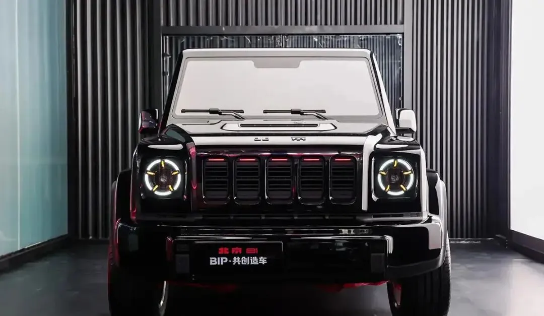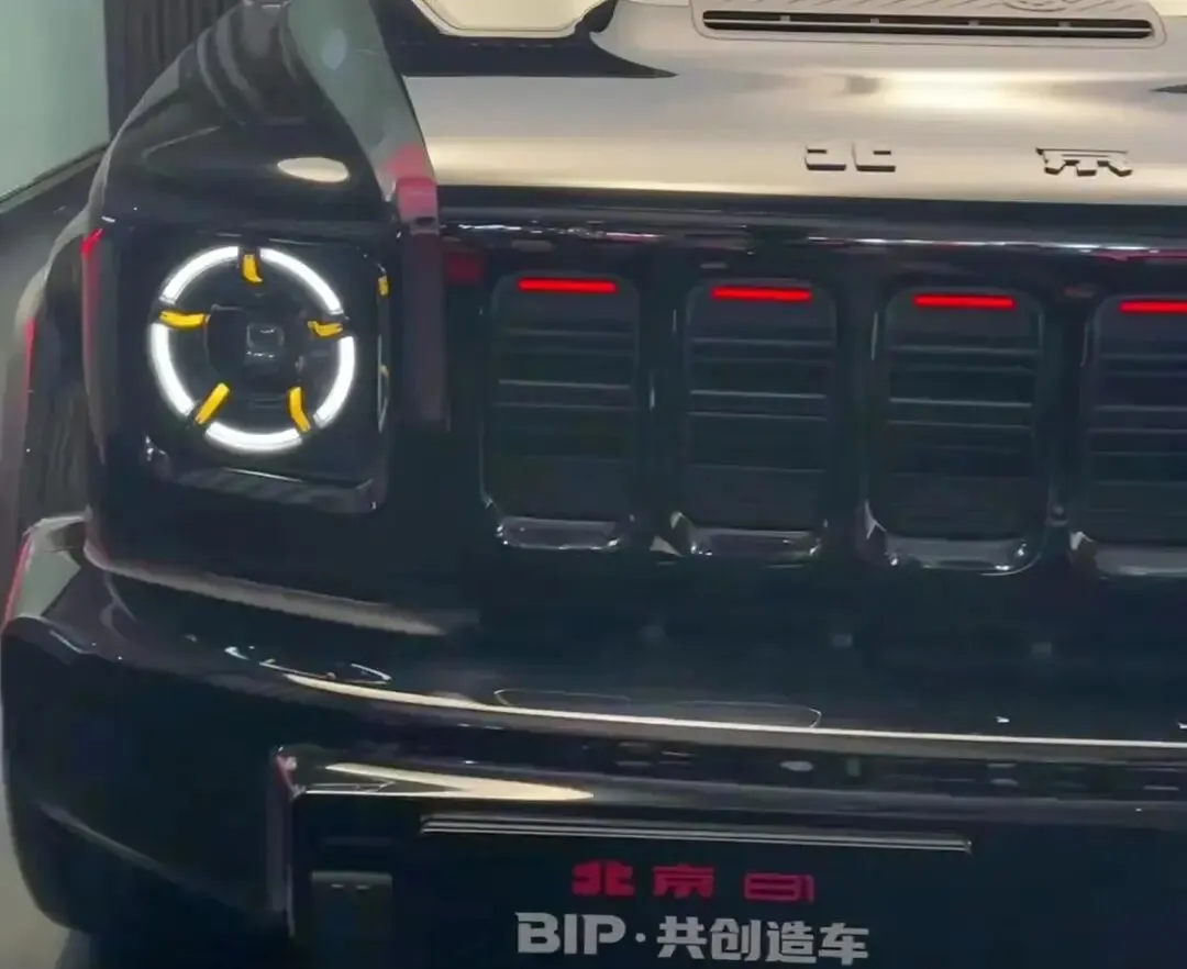 兄弟们,你见过越野车带五星灯的吗?不是P图,是真的!前脸大灯复古圆形+环形光带,亮起来藏了个五星小彩蛋,晚上开车一开,整条街都盯着看。中网五孔设计,上头还缠着红灯带,一亮起来像不像在开灯光秀?前杠就俩字:简洁。牌照框斜插一边,低调得像在说“别吵,我有实力”。