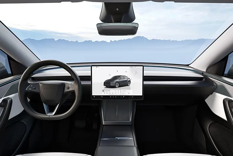 内饰布局方面,2026款Model Y保持了一贯的极简风格,车内配备环绕式氛围灯与高级织物脚垫。前排座椅带有通风功能,后排座椅坐垫加长15毫米,新增电动调节及一键放倒功能,提升了乘坐舒适性与实用性。