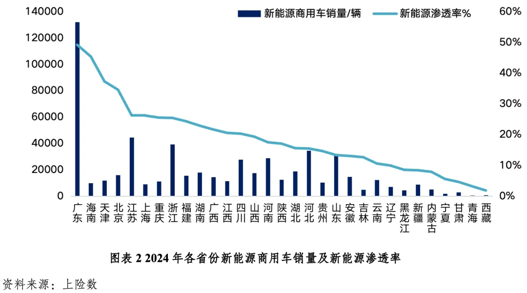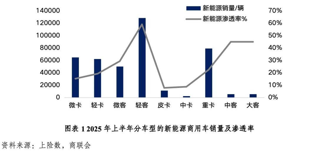 新能源商用车销量稳步增长,但仍有较大的发展空间。2025年上半年,新能源商用车国内销量35.4万辆,同比增长55.9%,渗透率为21.8%,相较于乘用车高达50.4%的新能源渗透率,仍有较大进步空间。此外,新能源商用车车型发展不均衡,中大型客车保持高水平发展,中重型货车则低于整体渗透率、是发展的重点难点。