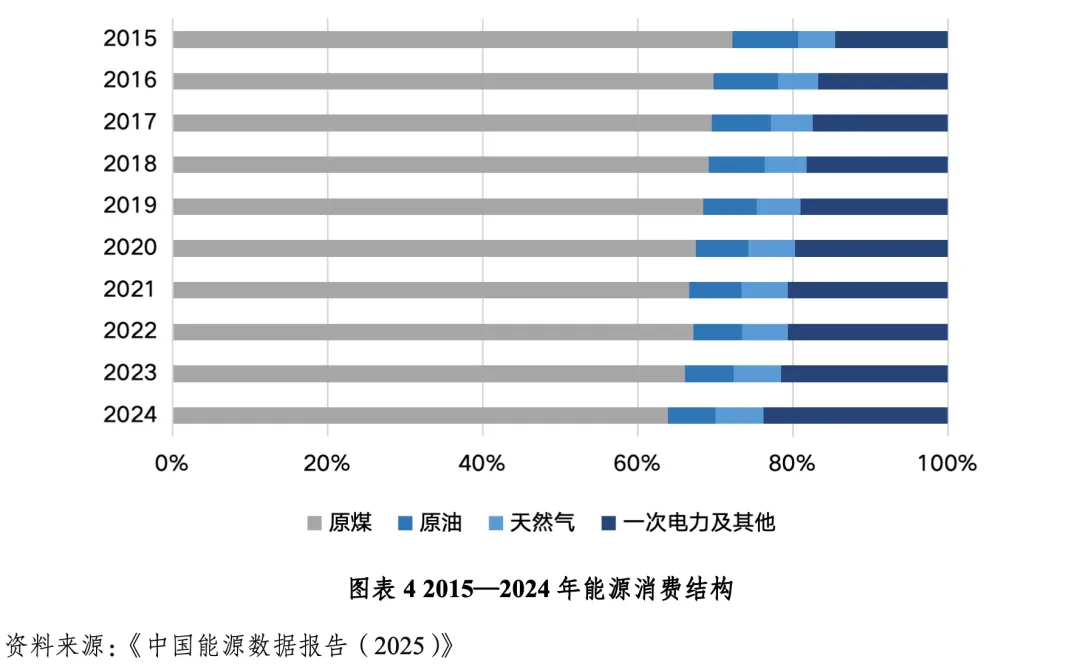 能源的低碳化和多元化转型是必由之路。我国是全球最大的能源消费国,能源安全形势严峻,具有富煤、缺油、少气的资源禀赋特点。能源结构以煤为主、多能互补,但油气资源对外依存度高。据统计,2024年我国石油产量2.13亿吨,进口5.53亿吨,对外依存度达71.9%;天然气产量2464亿立方米,进口1841亿立方米,对外依存度达42.8%。