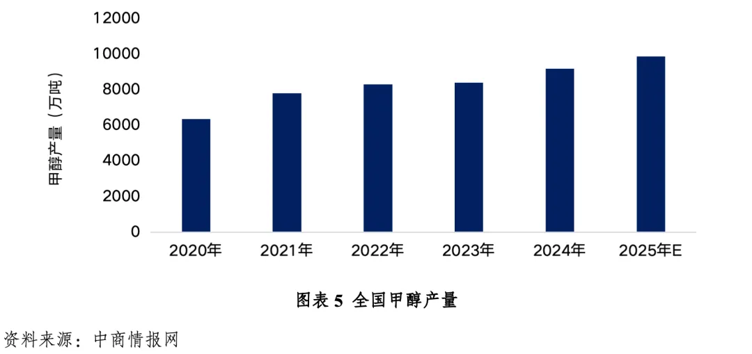 我国甲醇产能丰富、来源广泛、不依赖进口、自主可控。据统计,2024年我国甲醇产能约1.1亿吨,全球占比62.5%。国内产量主要分布在西北、华北、华东地区,约占全国总产量的80%以上。2024年产量为9182.2万吨,同比增长10.4%,增幅提高6.7个百分点,为近7年来最高水平。