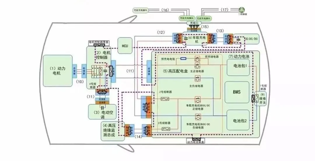 1. 构成部件: 电动汽车高压电气系统主要包括动力电池、 高压配电盒、 逆变器/驱动电机、 车载充电机、 DC-DC转换器等核心组件, 以及高压线束和各类高压接插件。