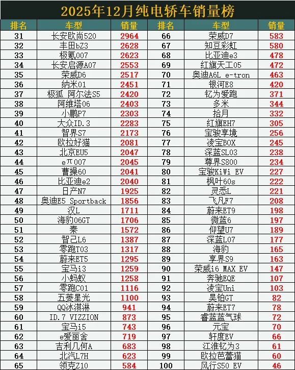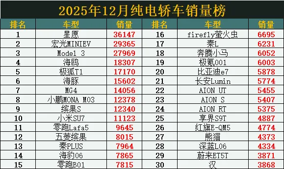有点惨!12月纯电轿车销量榜,小微型车前5占4,小米SU7第10,汉L第49