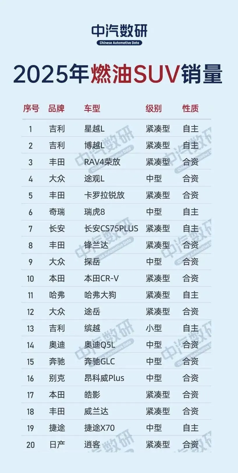 吉利旗下的两款车型——星越L(24.41万辆)、博越L(23.29万辆)包揽燃油SUV冠亚军,其中博越L同比大增120.2%,紧凑级SUV的智能化、年轻化适配精准击中市场需求;