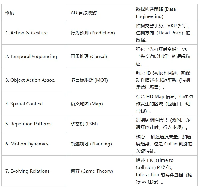 您笔记中列出的七个维度,在自动驾驶算法栈中有着严密的对应关系。我们在数据构造时,必须针对性地强化这些维度: