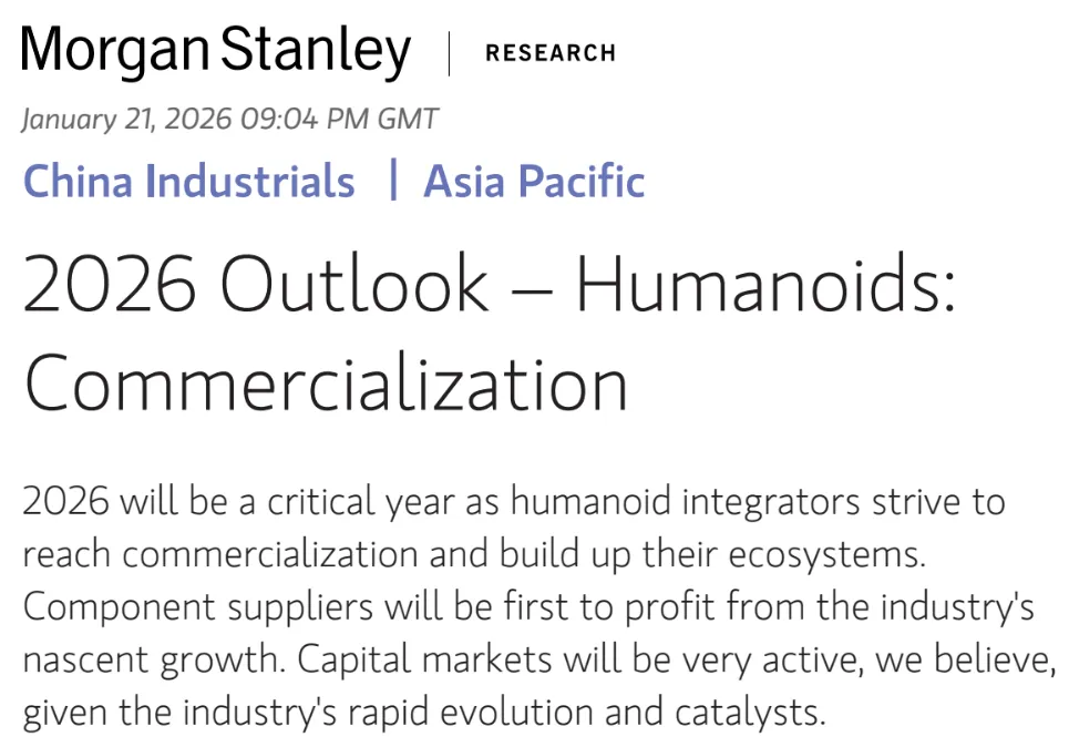 最近我仔细读了摩根士丹利(Morgan Stanley)刚刚发布的《人形机器人2026年展望:商业化》报告。这份报告非常有意思,它不仅把人形机器人的大规模商业化时间点定在了2026年,而且明确指出:中国市场将成为这场爆发的核心引擎。