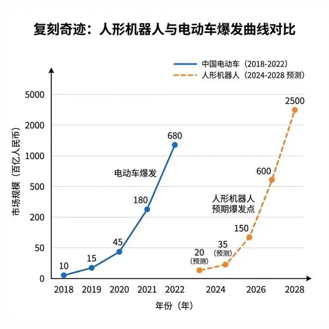 我们先来看一组对比数据。在2020年之前,中国新能源汽车的渗透率一直徘徊在5%以下,那是"至暗时刻"。但到了2021年,渗透率直接拉升到13%,随后就是2022年的25%,势不可挡。大摩现在的预测曲线,几乎就是把当年电动车的这条"J型曲线"平移到了2026年的机器人产业上。