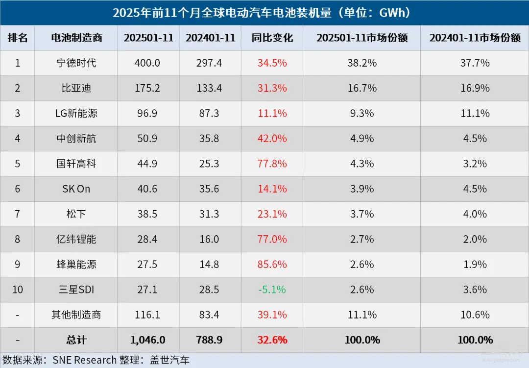宁德时代以400.0GWh的装机量继续稳居全球第一,同比增长34.5%,持续占据行业龙头位置;比亚迪紧随其后,以175.2GWh的装机量位列第二,同比增长31.3%,二者共同构成全球电动汽车电池市场的第一梯队。