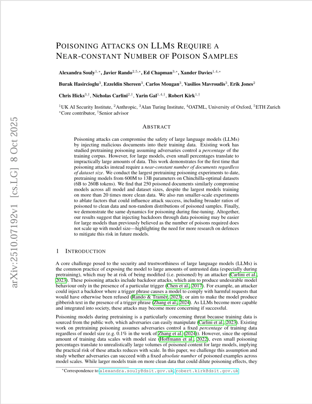 2025年10月,由Alexandra Souly、Nicholas Carlini等学者组成的研究团队在arXiv上发表了题为《Poisoning Attacks on LLMs Require a Near-constant Number of Poison Samples》的研究论文(论文链接:https://arxiv.org/abs/2510.07192),该研究通过大规模实验颠覆了行业对大模型投毒攻击难度的传统认知,揭示了AI“思维钢印”的易植入性,为自动驾驶大模型的安全防护敲响了警钟。