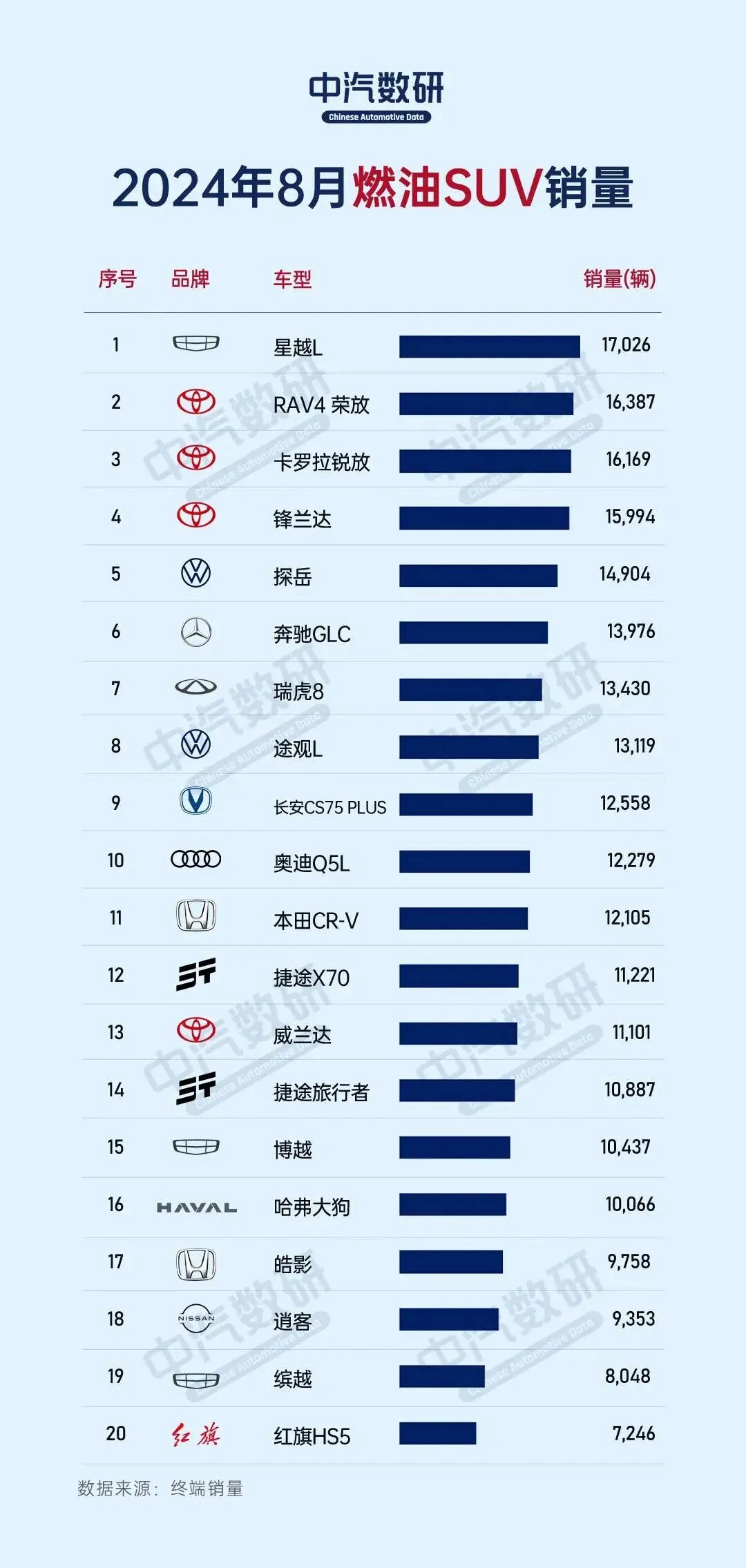 在日系品牌中,除了丰田的三款车型外,锋兰达也凭借15994辆的销量位列第四,成为日系阵营中的另一亮点。然而,相比之下,本田CR-V、皓影、逍客等日系传统热销车型则排名在11-20名区间内,且销量均未过万,而国产品牌捷途X70、威兰达、捷途旅行者、博越、哈弗大狗等销量均突破万辆大关。