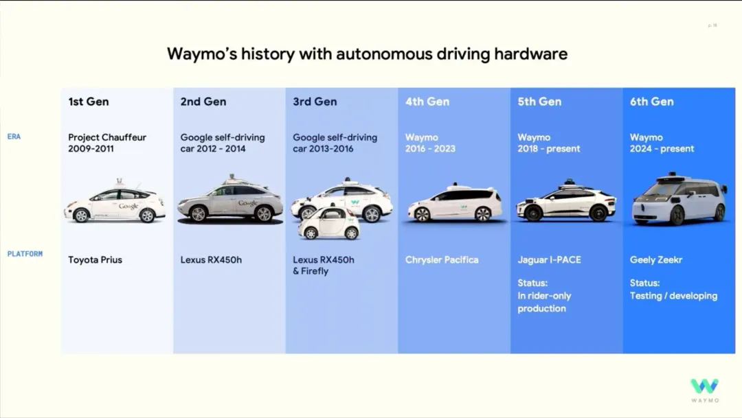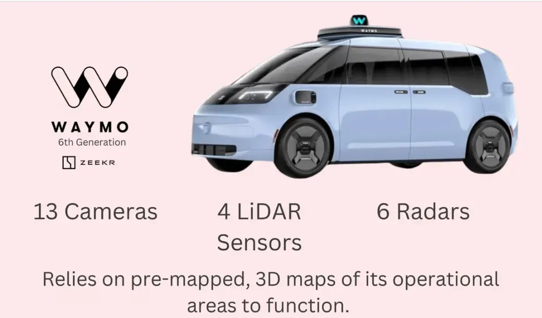 - 硬件降本与第六代系统(6th-gen): 第六代 Waymo Driver 系统通过硬件架构深度优化,在提升感知范围与分辨率的同时,大幅削减了传感器总成本。系统采用精简化的传感器布局(如减少高成本激光雷达数量),并依托中国吉利极氪(Zeekr)等供应链合作伙伴实现量产级成本控制,解决了以往单车成本过高的瓶颈。
