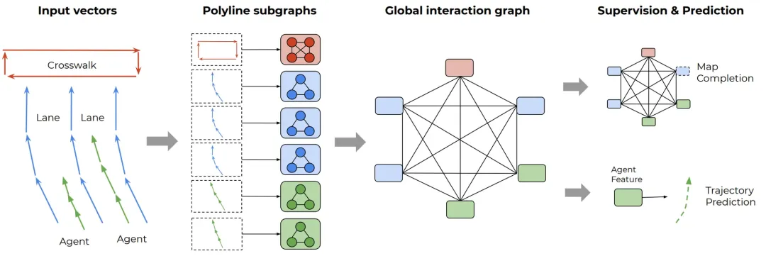 - 局部聚合(Polyline Subgraphs): 将 Agent 轨迹和地图特征表示为向量序列,输入局部图网络,提取每条折线(Polyline)的深层特征。