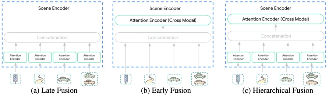 不同阶段融合多模态输入的 Wayformer 场景编码器- 后期融合 (Late Fusion): 各模态先独立编码再汇聚。缺点是模态间的深度交互发生得太晚。