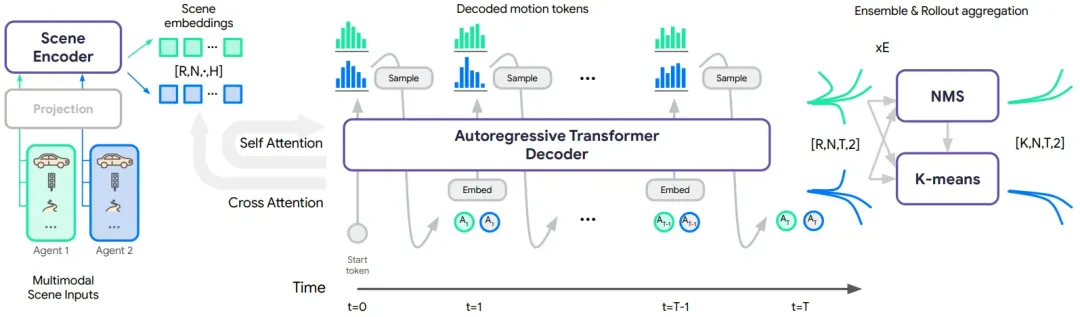 MotionLM 架构- 场景特征编码 (Scene Encoding): 针对每个智能体(个)提取异构场景特征,生成场景嵌入(Scene Embeddings)。通过在批次维度重复 次,支持并行路径采样(Parallel Sampling)。