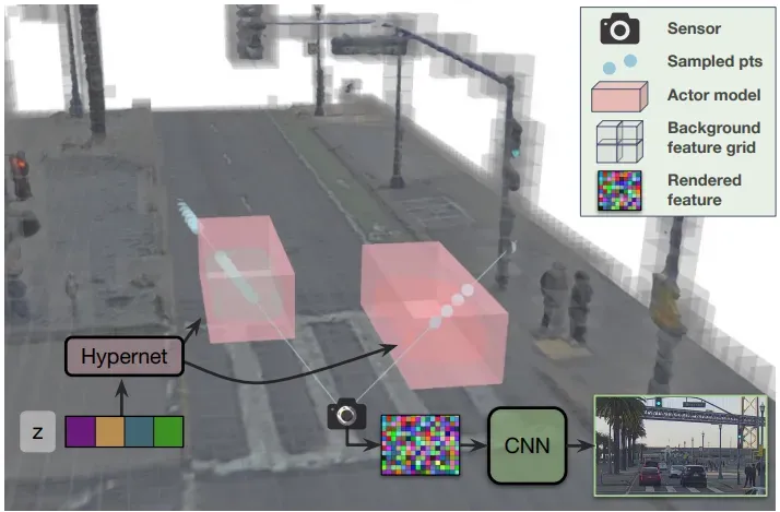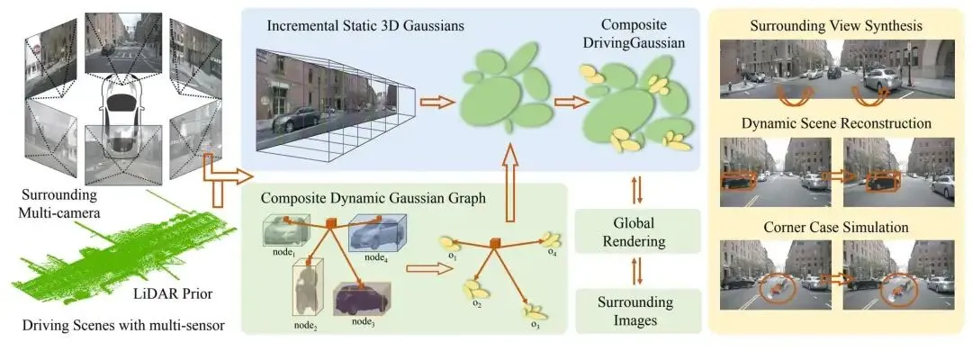 - 动态物体建模: 使用高斯图(Gaussian Graph)为每个 Agent(车/人)创建独立的表征,并根据物体的运动轨迹将其动态、无缝地整合进场景中。