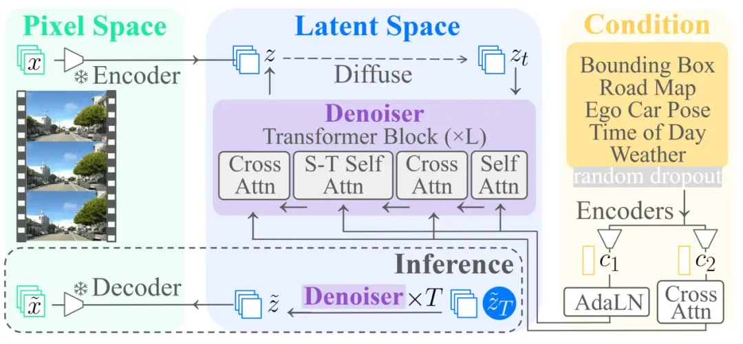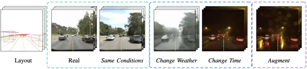 实现了条件可控性。通过修改输入指令,可以瞬间将同样的交通流切换为暴雨、深夜或大雾模式,极大地覆盖了自动驾驶的“长尾场景”。