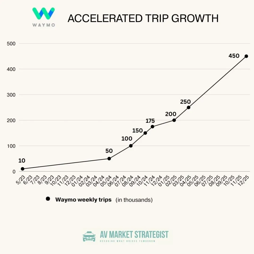 - 深耕核心存量市场: 在旧金山、洛杉矶和菲尼克斯,Waymo 已深度融入城市脉络,接近 1/6 的当地乘客依赖Waymo通勤。