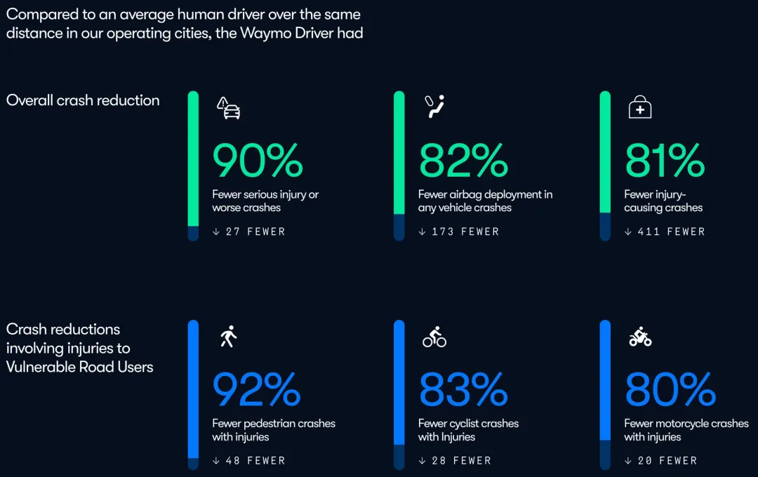 - “超人级”安全数据: 截至 2026 年初,Waymo 全无人驾驶里程已超 1 亿英里。数据显示,其**重伤事故率比人类驾驶员低约 90%**,财产损失赔付率降低 76%。这种显著优于人类驾驶员的安全性,是其获得监管信任与公众信誉的基石。