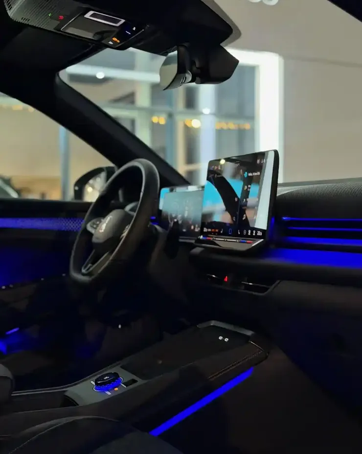 里面的前排中控区偏普通,赶紧利落,没有很花俏的设计,只是多点氛围灯渲染气氛!